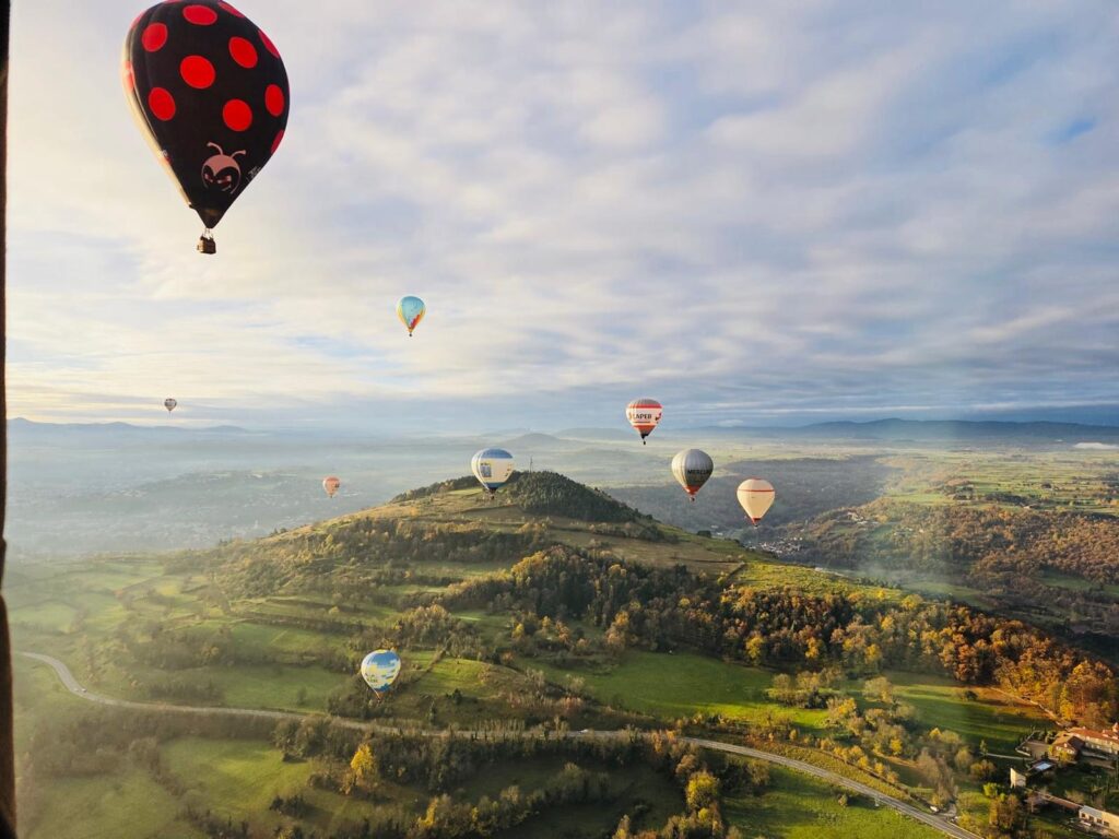 Ces lieux offrent un paysage typique de l’Auvergne : sucs volcaniques, plateaux sauvages et lumières changeantes. À chaque décollage, le spectacle est total. Les montgolfières prennent leur envol dans un calme impressionnant, sous le regard émerveillé des spectateurs.